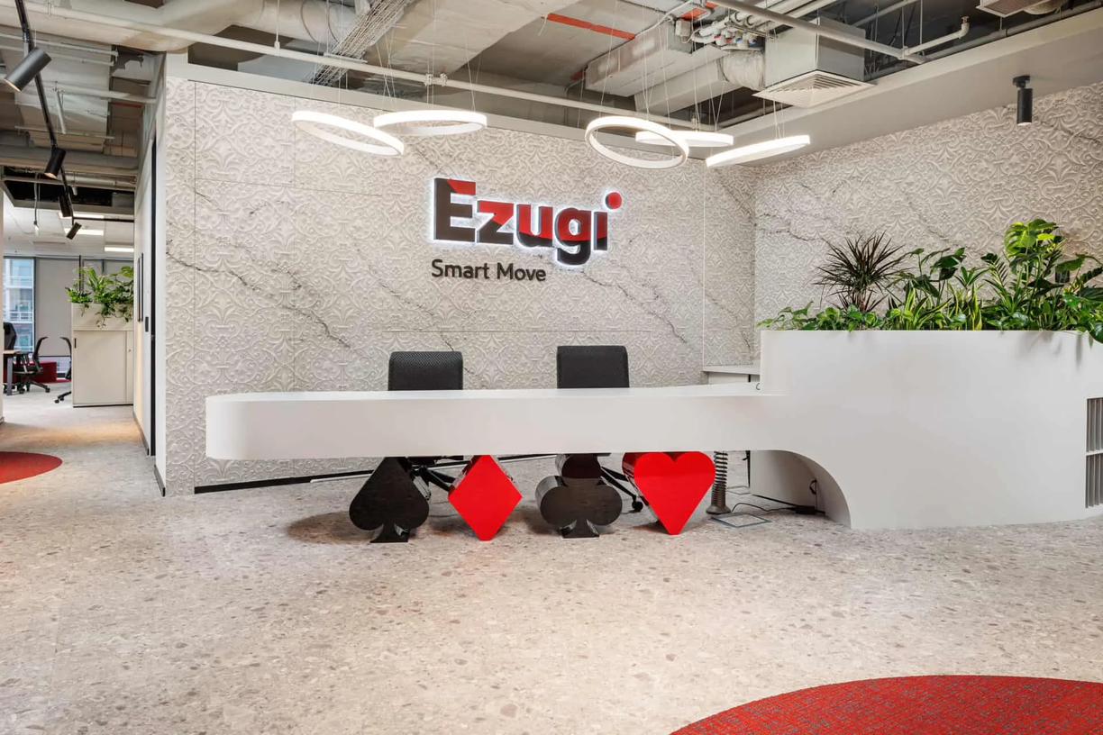 Office interior design for a global live dealer gaming company, calibrated for collaboration, acoustics, brand identity, and a clearer daily work experience.